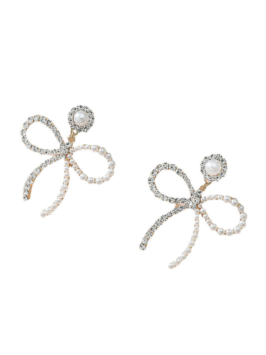 High Quality Fashion Temperament Pearl Bow Earrings Full of Diamonds