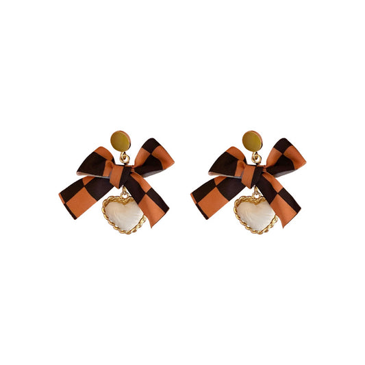 High Quality Fashion Silver Needle Fabric Checkered Bow Love Earrings