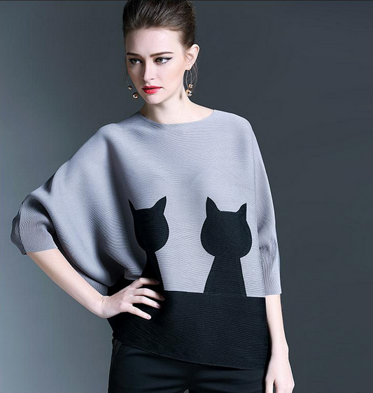 High Quality Fashion Round neck loose stitching cat pattern sleeves stretch pleated print tops women